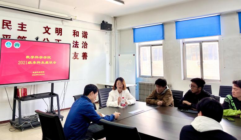 2023年5月,数学科学学院2021级本科生各专业座谈会相继召开。本次系列活动由辅导员力思琪主持,学院党委副书记熊立婷、副院长刘桂荣与2021级本科生各专业学生代表座谈,共同探讨、剖析学业与未来规划问题。