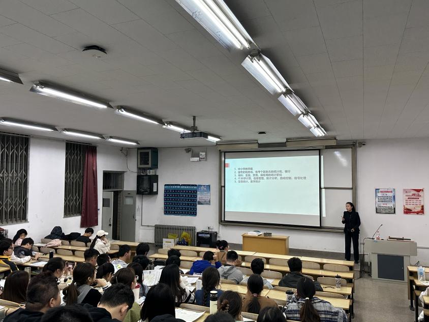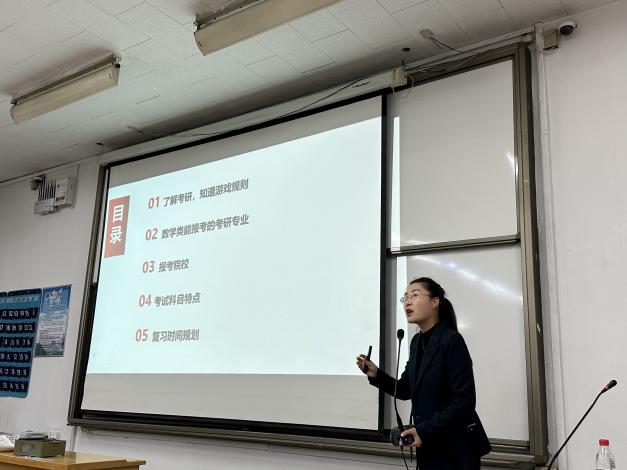 讲座伊始,田蕊老师就数学专业学生就业相关问题作出指导与分享。首先,田蕊老师向大家介绍了未来可选择的就业方向,包括中小学教师、公务员、银行、IT行业以及生物医学统计等等。接着,就考研的流程为大家进行了详细讲解,分阶段介绍考研准备过程,着重讲解了如何确定个人择学校与择专业问题以及报名时间安排。通过详细的讲解,使同学们对考研有了最基础的了解。