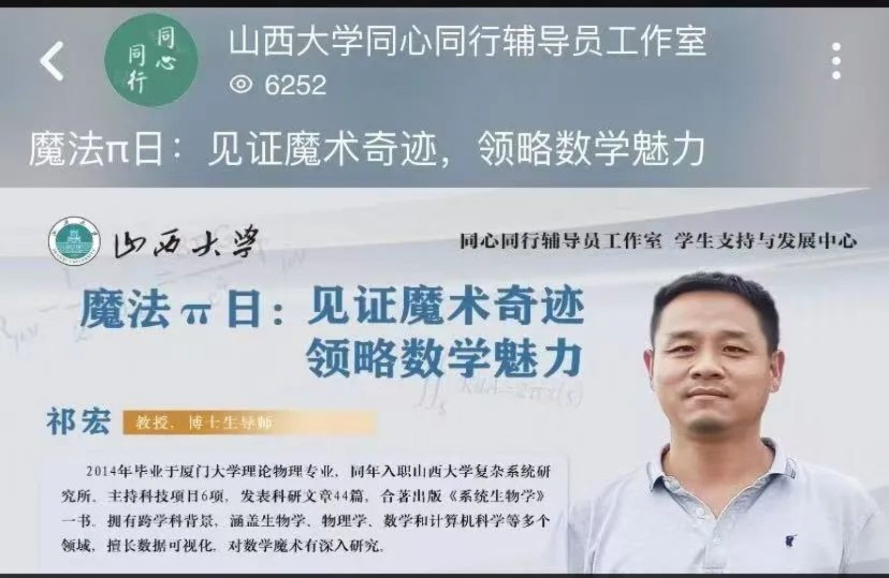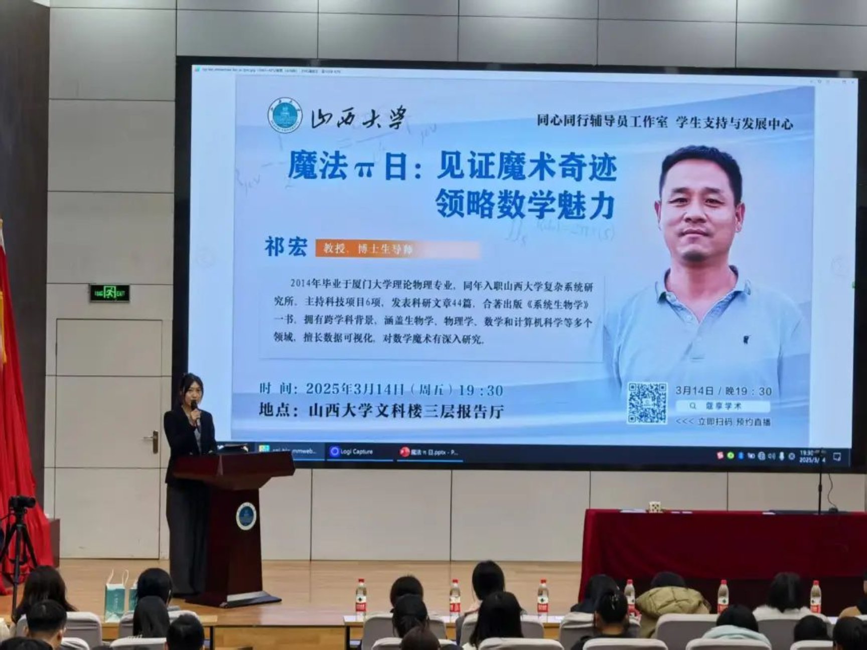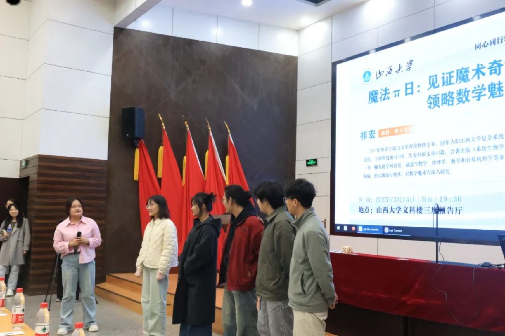2025年3月14日,第六个国际数学日如期而至,山西大学同心同行辅导员工作室精心策划并举办了“魔法πDay”主题活动,特邀复杂系统研究所祁宏教授带领同学们一同见证魔术奇迹,领略数学的无穷魅力。本次活动由工作室成员陈政婷主持,全校师生代表300余人共同见证了这场数学与魔术的奇妙交融。